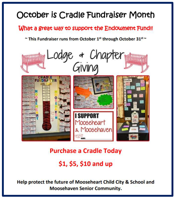 With that said, it’s important to note that Moose Charities will always need our support. Moving forward, next month is the Cradle Fundraiser and I hope that each of you will consider unique methods to help raise money for our children at Mooseheart at your local Lodge. Remember folks, when you participate in the Cradle Fundraiser you are getting endowment donations from your members and those visiting your Social Quarters. And your Lodge and Chapter get credit towards the giving!
